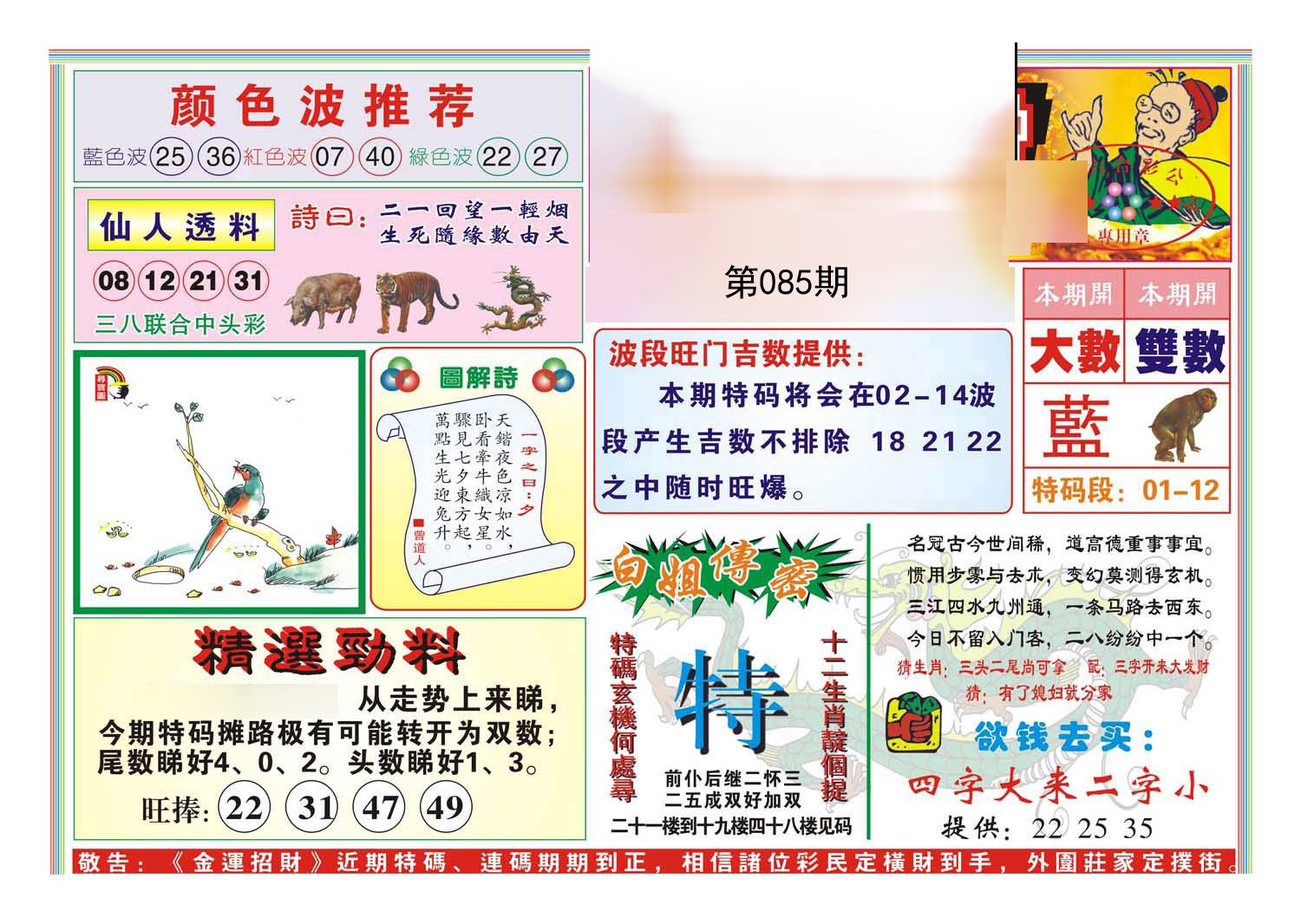 085期金牌波色【绿波】开:0 |